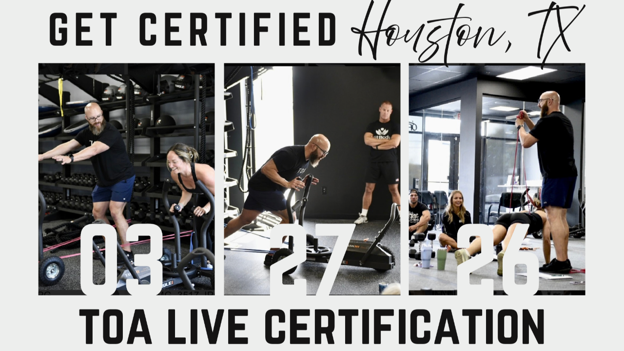 Get TOA Certified in-person! March 27-28 in Houston, TX at Evolution Fitness and Wellness. 7510-F Cherry Park Dr, Houston, TX 77095 Includes: 2 day instruction + 90 days of TOA Select + 2.0 CEUs (NSCA, NASM). Spots are limited, register today to reserve your spot.
